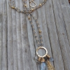 The handforged clasp has been crafted by me in my studio. The shepherd's hook end links to the hammered circle (approximately 3/4") securely when worn doubled. The hammered circle is embellished with a variety of Blue Quartz & Labradorite gemstones, as well as a handcrafted fringe swinging below a gorgeous Labradorite rondelle.