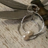 Hammered, oxidized sterling silver is hand-formed into a circle, then tumbled to a high polish. A beautiful, Grade "A" freshwater pearl is centered to the front of each earring and securely wrapped with dainty sterling wire. Dangling from handforged sterling earwires, these earrings catche the light with every movement. Each earring measures approximately 2 inches from the top of the earwire, and the circle is appromately 1 1/4 inches in diameter.