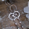 Heavy gauge sterling wire has been handforged, soldered, hammered and oxidized (to bring out the lovely texture), and form circles measuring about 1/2 inch each. These circles are connected with sterling jump rings and dangle securely from handforged sterling silver earwires. (I've left the earwires bright & shiny; it really makes the oxidization of the hoops pop!)