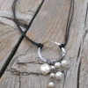 From the focal circle hang several charms & dangles of varying lengths and dimensions, all in complementing pearls. The color options are: Pink Pearl, White Pearl (shown) or Grey Pearl.
