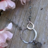 Gorgeous faceted labradorite rondelles have linked with oxidized sterling silver wire to create a sparkling gemstone chain. The gemstone chain has been secured to a handforged sterling circle (approximately one inch across) which as been hammered and oxidized, then tumbled for a high shine. A handforged S-Hook provides a secure clasp. A gorgeous, Grade A Labradorite "Onion" Briolette has been secured to the handforged circle with my signature wonky wrap. A trio of faceted rondelles dangles jointly with the briolette, adding movement & sparkle to this necklace, as well as a little feminine flair.