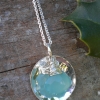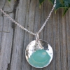 Hammered and highly polished, the sterling silver disc measures 3/4 inches across. One Grade A, Mystic Chalcedony briolette in the creamiest of sea-greens dangles in the center of the disc. Because the Chalcedony is so luminous, the sterling nearly glows with the reflection. Pendant shown hammered and without oxidation - finish is bare & shiny, but can be oxidized upon request.