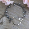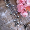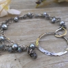 Three strands of sterling and gemstones are secured to a handforged sterling circle which as been hammered and oxidized, then tumbled for a high shine. A handforged S-Hook provides a secure clasp. The first strand is made up of gorgeous, faceted labradorite rondelles, measuring approximately 3mm in size. They have been linked together with sterling silver wire which has been lightly oxidized to bring out the texture in each wrap. A second strand of lightly oxidized hammered sterling chain adds sparkle and texture. The last strand consists of lovely peacock blue freshwater pearls which are linked using oxidized sterling silver. I love pearls, and I think the combination of textures and colors is both striking and versatile.