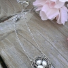 A trio of white pearls, each approximately 4mm in size, is held snuggly in a nest of oxidized sterling silver wire. The nest is approximately 5/8 inches across, and the pendant is secured on both sides to a sterling silver chain which adjusts from 16 to 18 inches.