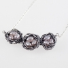 A trio of pink pearls, each approximately 4mm in size, is held snuggly in a nest of oxidized sterling silver wire. Three individual nests are then linked together to form a lovely, organic pendant. Each nest is approximately 5/8 inches across, and the pendant is secured on both sides to a sterling silver chain which adjusts from 16 to 18 inches.