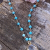 In this necklace, gorgeous faceted Sleeping Beauty Turquoise rounds (about 3mm each) have linked with 14K Gold Filled wire to create a sparkling gemstone chain. The gemstone chain has been secured to a handforged 14KGF clasp, which has been tumbled for a high shine. The pendant is AAA Grade Quartz Crystal, secured in an 18K Vermeil (18K gold plating over sterling silver) setting.