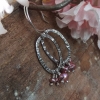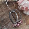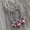 A cluster of deep pink freshwater pearl & rose-gold-plated pyrite rondelles dangle sweetly from the oval. All balled headpins have been made by me. The oval and wrap has been lightly oxidized to bring out the texture. The pearl is approximately 5x6mm and each rose-gold plated pyrite gemstone rondelle is approximately 4mm. Including the handforged sterling earwire, this earrings measures just over 1.75 inches in overall length.