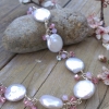 Lovely, luminous freshwater coin pearls - each approximately 12mm - in a stunning, iridescent white have been linked by hand with sterling silver wire to a round sterling hoop. Each hoop is embellished with Swarovski Crystal charms in various shades of pink. Although it is elegant enough to do it's job as a bridal piece, it is classic enough to complement a business suit or flirty sundress!