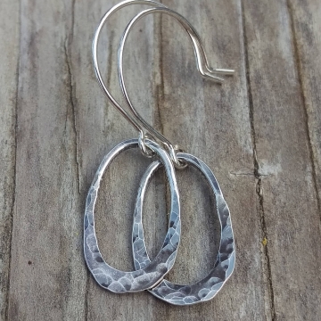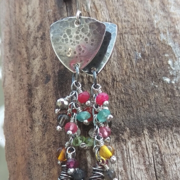 Shield Earrings in Hammered Sterling with Gemstone Cascade Finished with Wonky Wrap