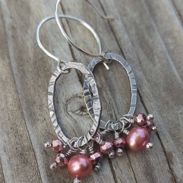 Shield Earrings in Hammered Sterling with Pink Quartz Brioletted Finished with Wonky Wrap