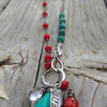 Coral and Turquoise Linked with Oxidized Sterling Wire - Handforged Clasp, Hand-stamped Medallion, Gemstone Charms