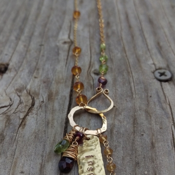 Peridot, Citrine and Garnet Linked with 14KGF Wire - Handforged Clasp, Hand-stamped Medallion, Gemstone Charms