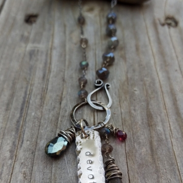 Mystic Labradorite, Labradorite and Garnet Briolette Linked with Sterling Wire - Handforged Clasp, Hand-stamped Medallion