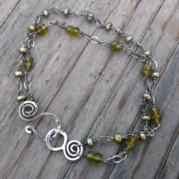 Green Gemstone Bracelet - Double Strand Vesuvianite & Freshwater Pearl Linked With Oxidized Sterling Silver