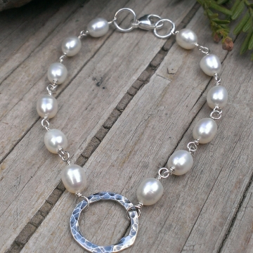 Hammered Circle Focal & White Pearl Link Bracelet - Oxidized, Polished